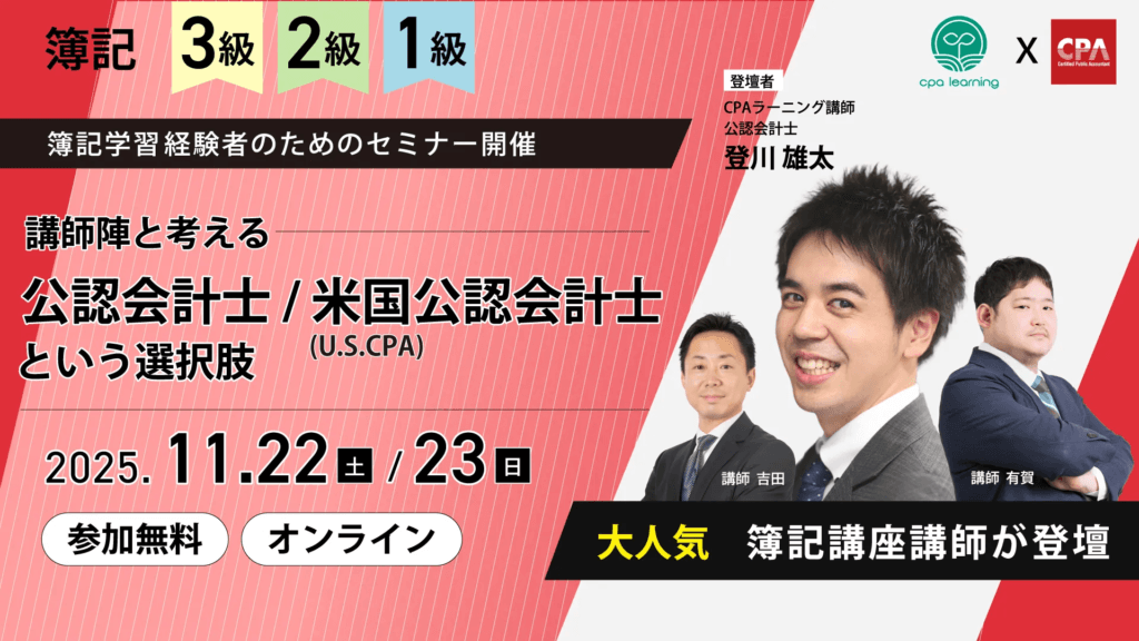 簿記受験者向けの「公認会計士」&「U.S. CPA」セミナーが開催されます。どちらも簿記1級の勉強がすごくアドバンテージとなる資格ですので、興味があればご参加ください。